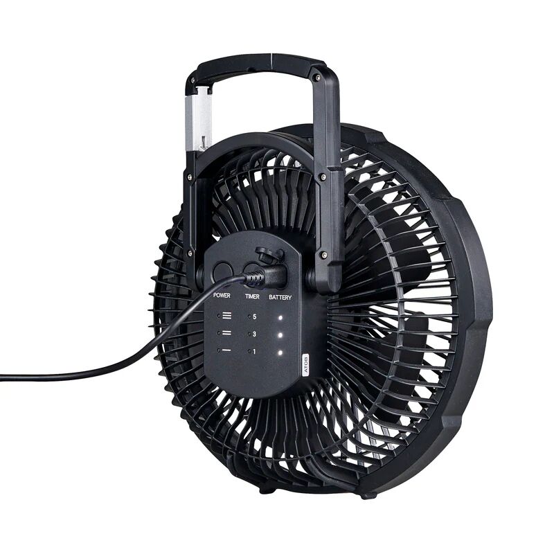 - Indicator lights show fan speed, timer, and battery level.